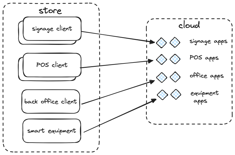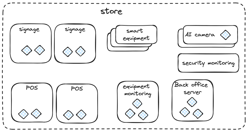Each store has a highly available cluster of edge servers. All applications run in the cluster. Edgecell makes this deployment pattern possible.
